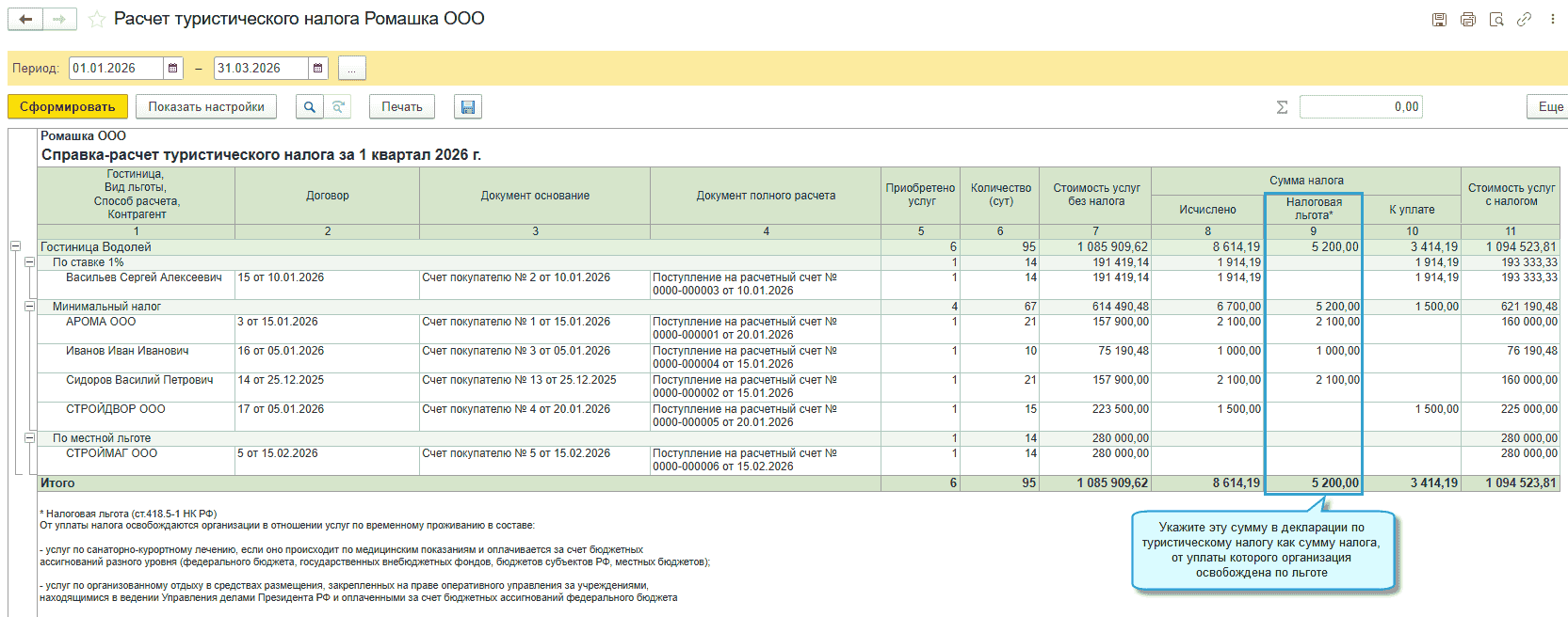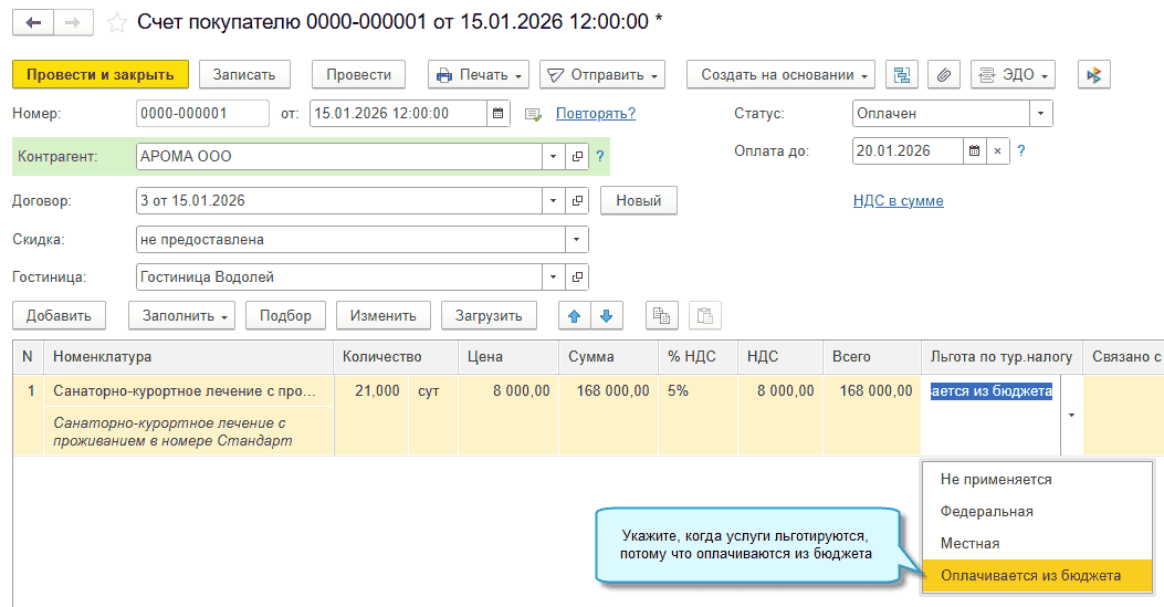 Добавлена возможность рассчитать туристический налог с учетом льготы, предоставляемой при оплате услуг по проживанию из бюджета (Федеральный закон от 28.11.2025 № 425-ФЗ).