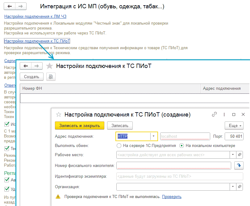 Настройка подключения к ТС ПИоТ привязана к кассе. При указании параметров подключения автоматически запускается получение данных подключенной к ТС ПИоТ кассы. ТС ПИоТ может быть настроен как на клиенте, так и на сервере. Рабочее место позволяет разграничить доступ сотрудников к чужим настройкам.