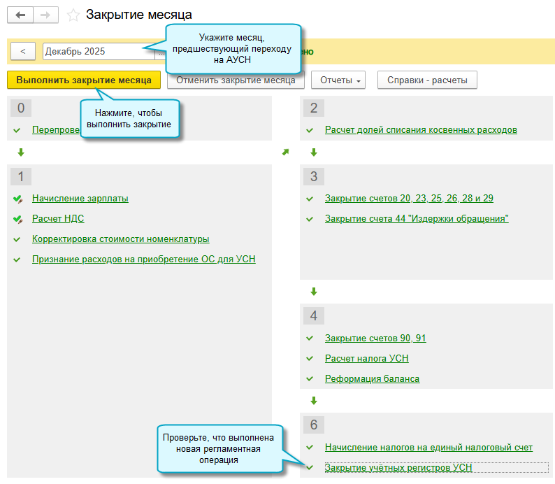 Полный интерфейс: меню "Операции - Закрытие периода - Закрытие месяца - Закрытие учетных регистров УСН".