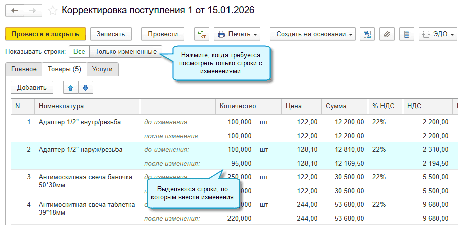 Теперь выделяются строки, по которым внесены изменения, в документах Корректировка поступления и Корректировка реализации.
