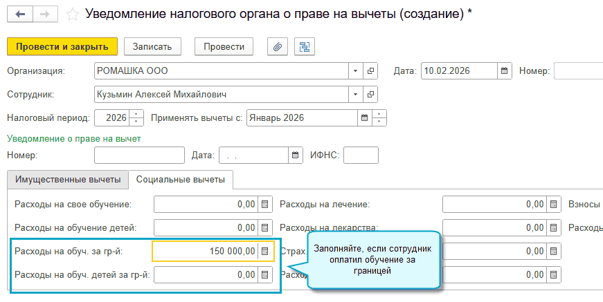 Полный интерфейс: меню "Зарплата и кадры - НДФЛ - Все документы по НДФЛ - Уведомление налогового органа о праве на вычеты".