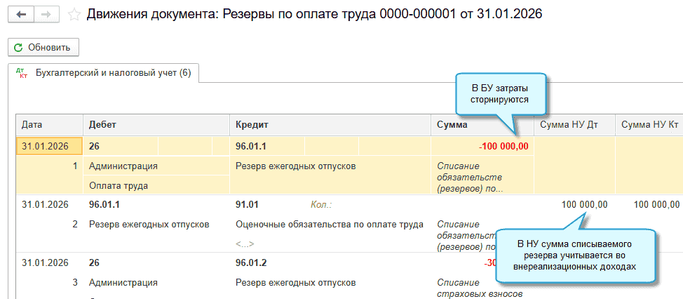 С 2026 года списание резервов по оплате труда в бухгалтерском учете отражается на счетах затрат проводкой методом "красное сторно", а не обратной проводкой, а в налоговом учете по налогу на прибыль учитывается во внереализационных доходах (п. 4 ст. 324.1 НК РФ).