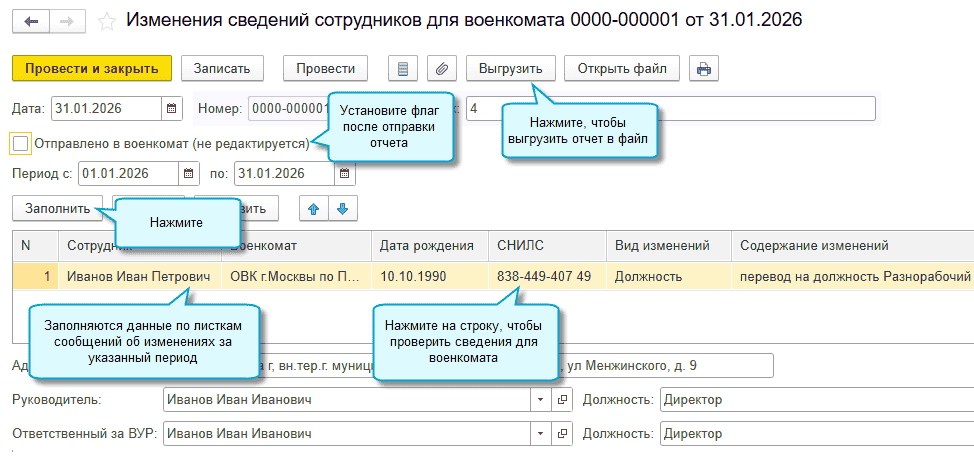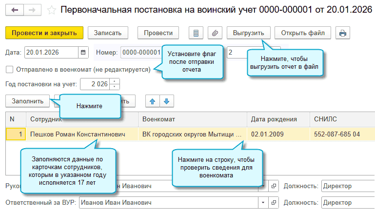 Для подготовки отчетов с выгрузкой добавлены документы в новом журнале Сведения для военкоматов: