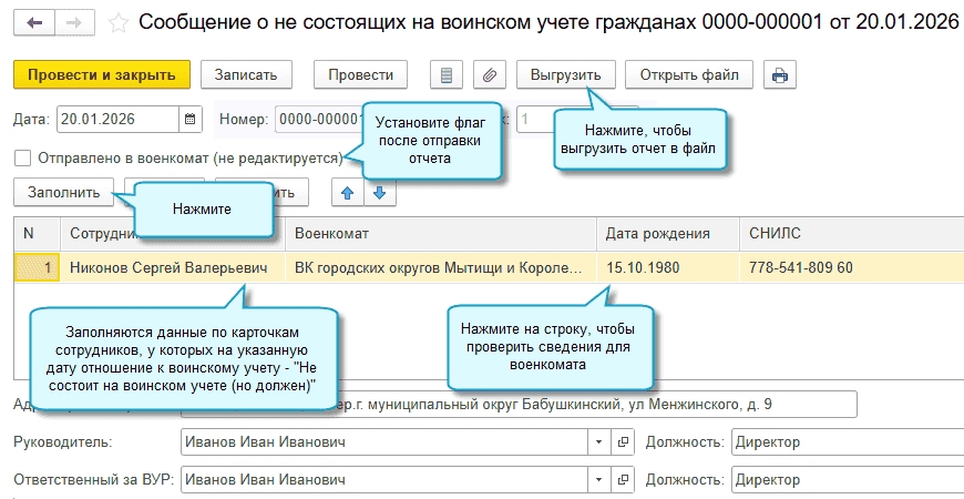 Полный интерфейс: меню "Зарплата и кадры - Воинский учет - Сведения для военкоматов - Сообщение о не состоящих на воинском учете гражданах".
