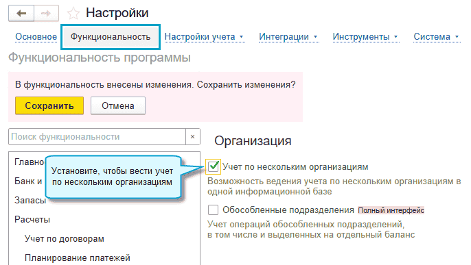Простой интерфейс: меню "Настройки - Функциональность - Организация".