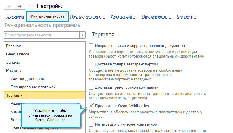 Если вы уже ведете учет в 1С:Бухгалтерии с установленной настройкой "Расчеты с покупателями и поставщиками", то воспользоваться упрощенным учетом продаж на маркетплейсах в существующей информационной базе (приложении) не получится. Но в начале работы в новой информационной базе (приложении) вы можете отказаться от учета расчетов с покупателями и поставщиками и использовать упрощенный учет. Если изменятся условия работы организации, например, переход на ставку НДС 22%, то можно будет перейти на полный учет продаж с ведением товарного учета и расчетов с контрагентами. Для этого достаточно будет установить флаг в настройке "Расчеты с покупателями и поставщиками". Простой интерфейс: меню "Настройки - Функциональность". Простой интерфейс: меню "Товары - Маркетплейсы".