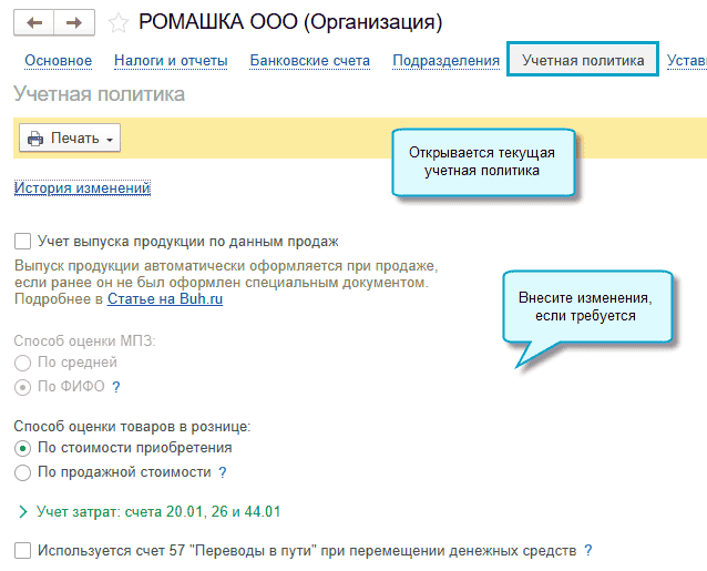 Теперь в простом интерфейсе достаточно перейти в раздел Учетная политика в карточке организации, чтобы ознакомиться с текущей учетной политикой. При необходимости можно внести и сохранить изменения.