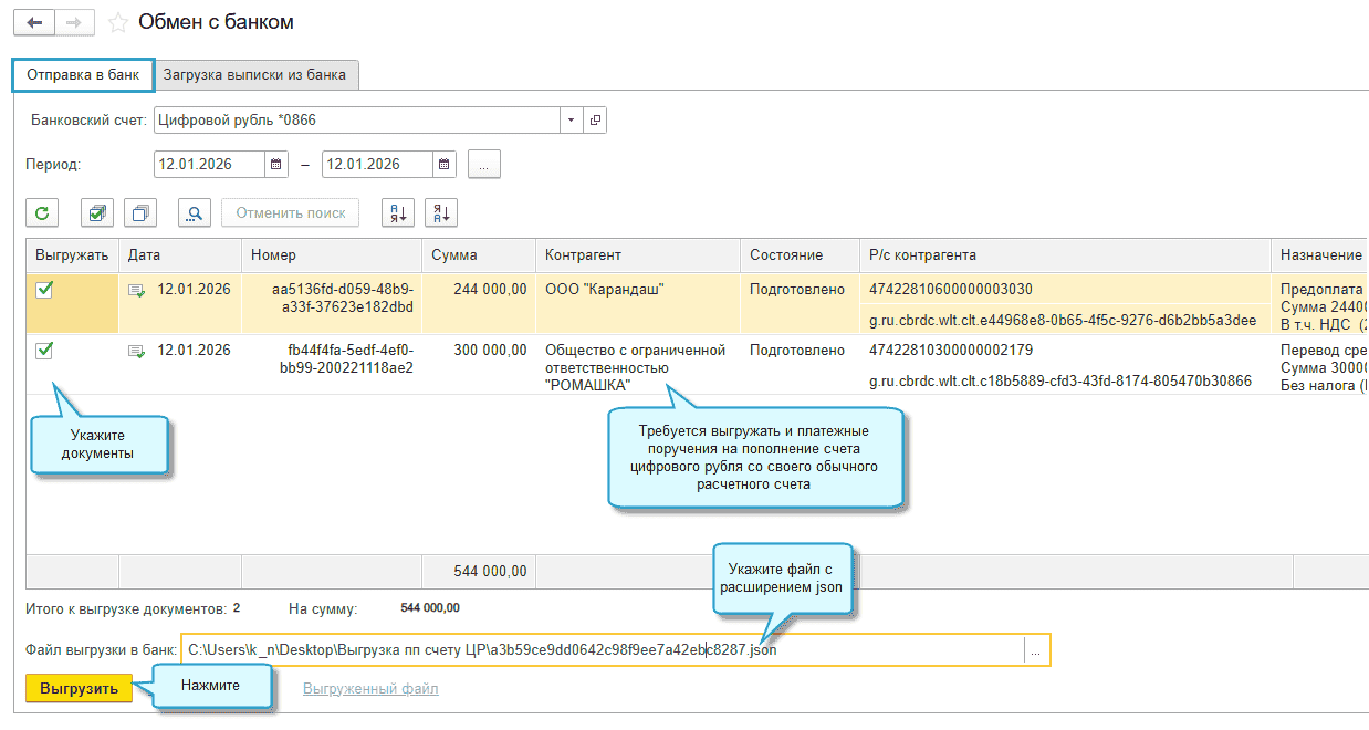 Выгрузите в файл подготовленные платежные поручения. При загрузке этого файла в личном кабинете банка будут создаваться черновики распоряжений для платформы цифрового рубля. Распоряжения потребуется подписать и отправить на исполнение непосредственно в личном кабинете банка.