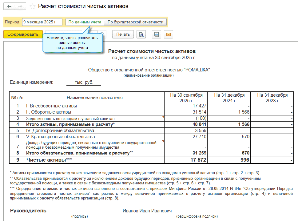 Добавлена возможность рассчитать стоимость чистых активов в соответствии с приказом Минфина России от 28.08.2014 № 84н в редакции от 31.03.2025.