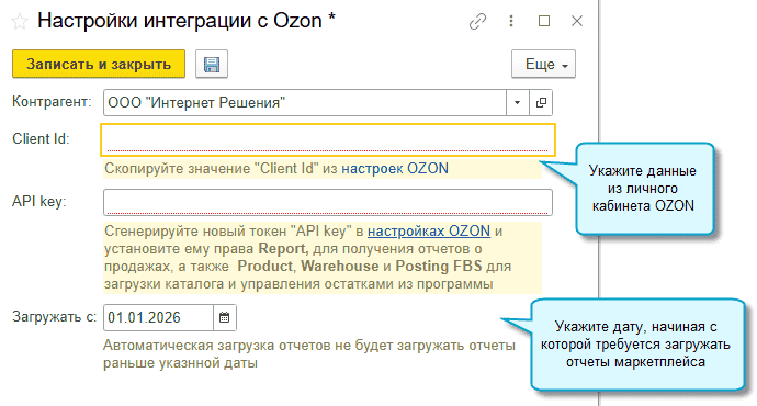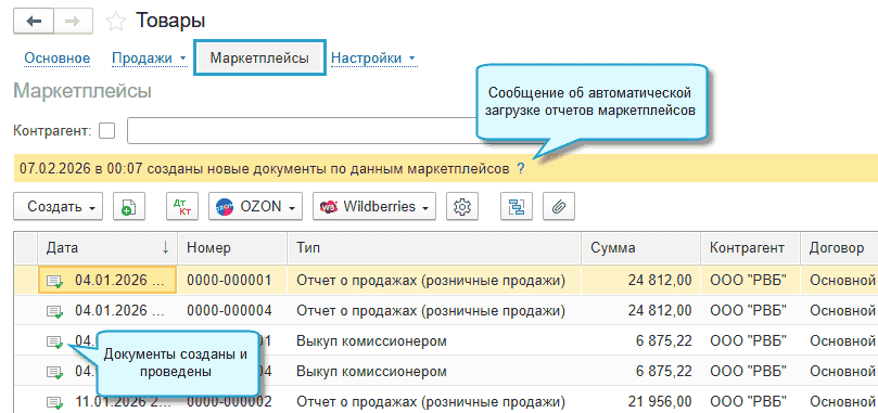Добавлена возможность вести упрощенный учет продаж на OZON и Wildberries для тех, кому не требуется вести учет товаров и расчетов с контрагентами. При его использовании не нужно вводить документы по поступлению товаров от поставщиков и их отгрузке на маркетплейсы.