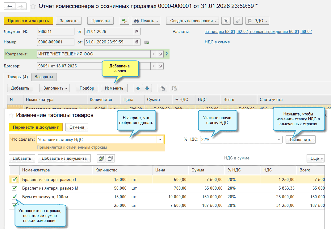 Добавлена возможность выполнять групповое изменение данных по товарам в отчете комиссионера о розничных продажах. Например, для всех товаров вместо ставки НДС 20% установить ставку 22%.
