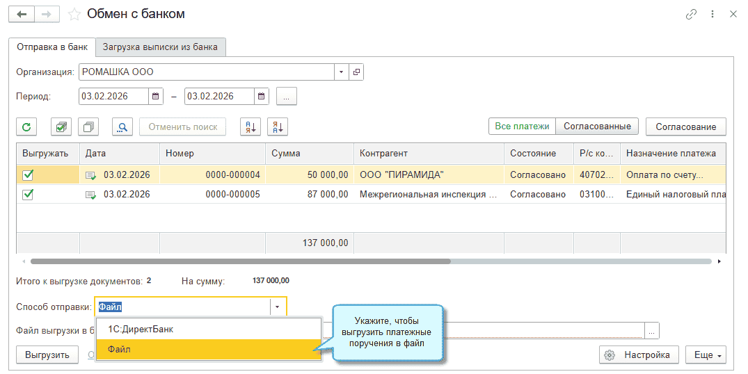 Добавлена возможность выгружать платежные поручения в файл, если подключен сервис 1С:ДиректБанк. Используйте такой способ в случаях, когда невозможно отправить платежные поручения в банк через сервис.