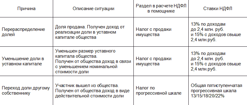 Поддержан расчет НДФЛ по доходам в связи с продажей и прочим выбытием доли в уставном капитале организации через помощник.