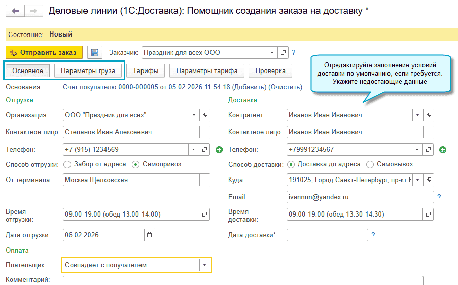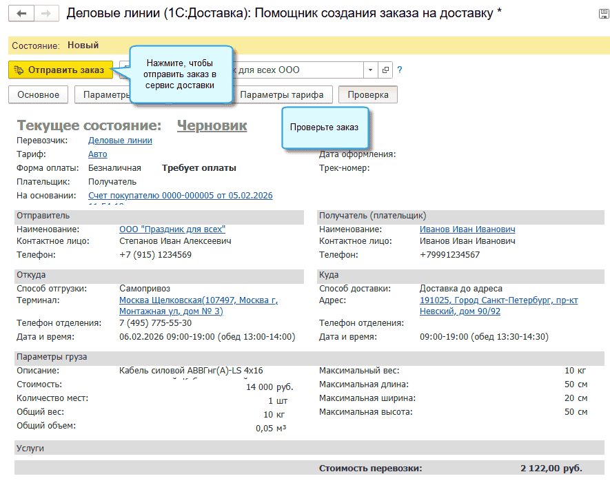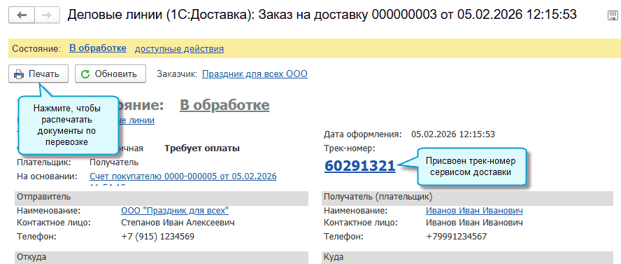 Добавлена возможность оформлять и передавать заказы на доставку в сервисы доставки прямо из счета покупателя и документов реализации. Поддерживается интеграция с сервисами доставки "Деловые линии" и "СДЭК", а так же имеется возможность отслеживать состояние заказов на доставку.