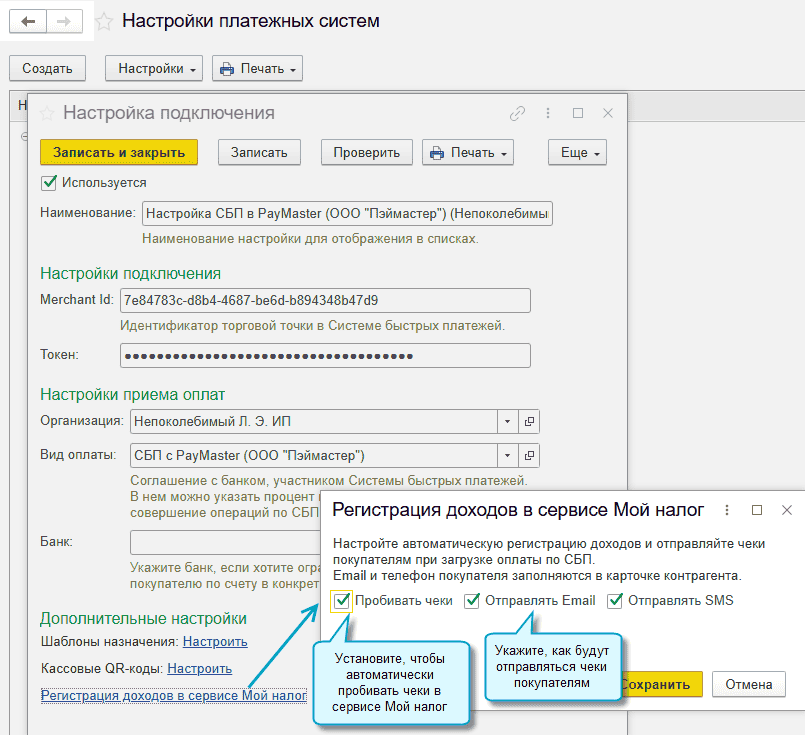 Полный интерфейс: меню "Администрирование - Настройки программы - Интернет поддержка и сервисы - Платежные системы (СБП) - Настройки подключения".