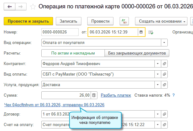 Добавлена возможность самозанятым автоматически регистрировать доходы в сервисе ФНС Мой налог. Чек автоматически формируется в сервисе Мой налог и отправляется покупателю при получении от покупателя оплаты по счету через СБП или ЮKassa. В других случаях чек не формируется автоматически.