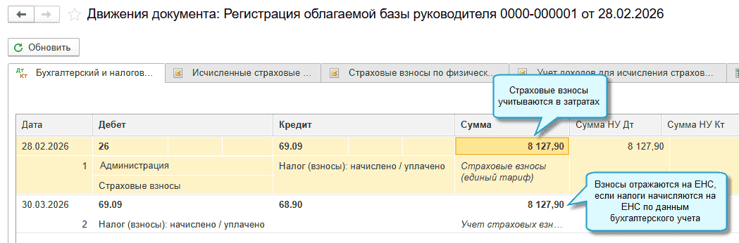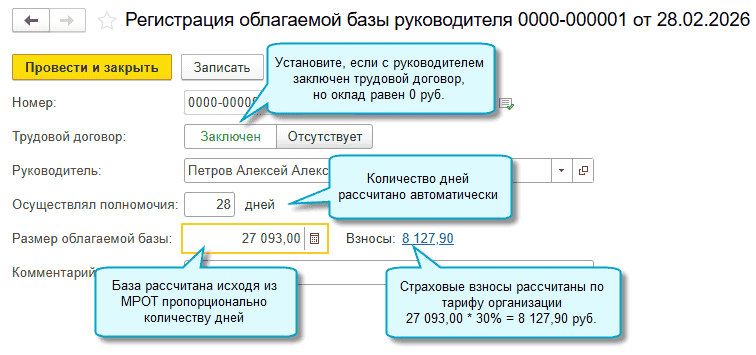 Если же с директором заключен трудовой договор и его оклад больше 0 руб., то страховые взносы автоматически доначислятся при проведении документа "Начисление зарплаты" за месяц.