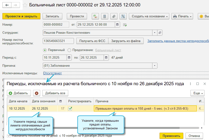 Добавлена возможность учитывать ограничение по продолжительности оплаты больничного листа работнику-инвалиду. Пособие по временной нетрудоспособности по причине заболевания или травмы выплачивается не более чем за пять месяцев в календарном году. Дни нетрудоспособности свыше лимита не оплачиваются (часть 3 статьи 6 Федерального закона от 29.12.2006 № 255-ФЗ).