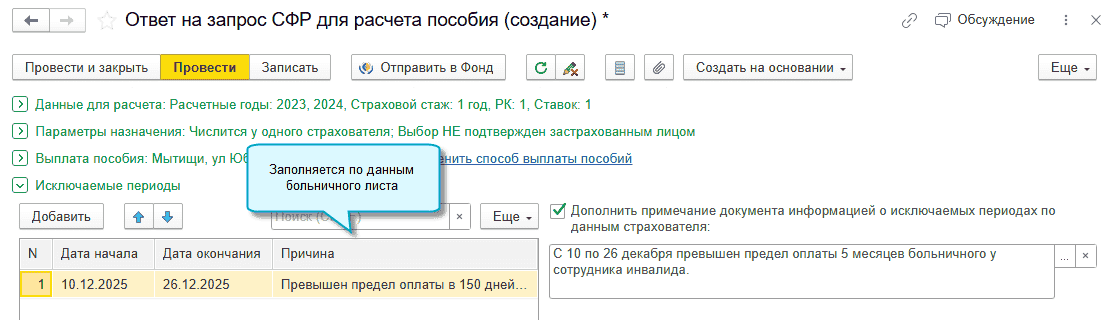 Полный интерфейс: меню "Зарплата и кадры - Пособия - Ответы на запросы СФР для расчета пособий".