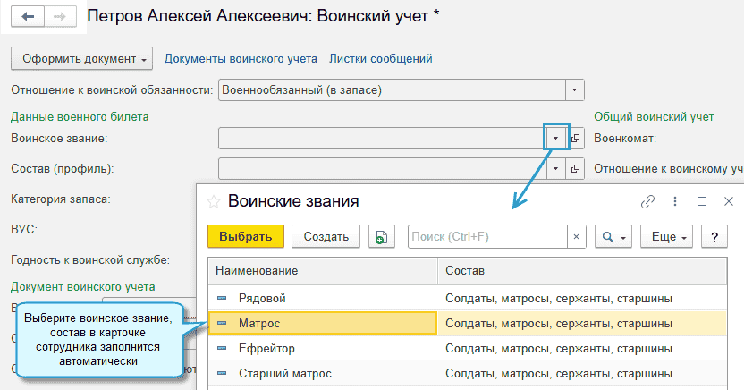 Добавлено автозаполнение состава при выборе воинского звания в карточке сотрудника по воинскому учету.