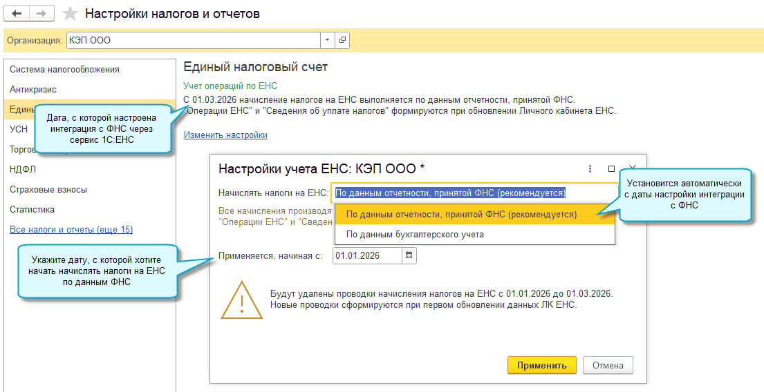 Добавлена возможность начать вести учет ЕНС по данным ФНС с даты более ранней, чем настроена интеграция с ФНС через сервис 1С:ЕНС. Например, когда сервис 1С:ЕНС подключен 01.03.2026, загрузить операции по ЕНС по данным ФНС начиная с 01.01.2026. Для этого достаточно выполнить следующую настройку