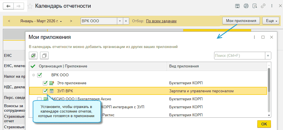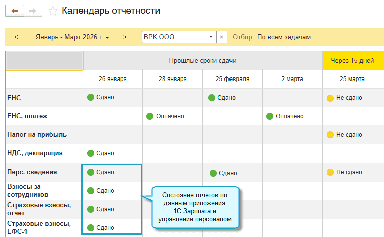 Добавлена возможность по календарю отчетности отслеживать сдачу отчетов, которые готовятся в приложениях 1С:Зарплата и управление персоналом.
