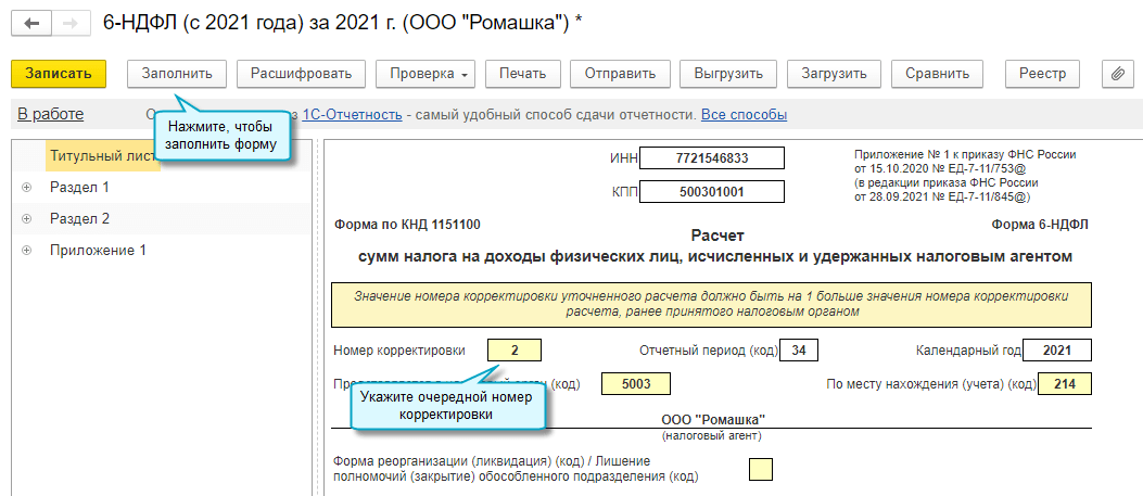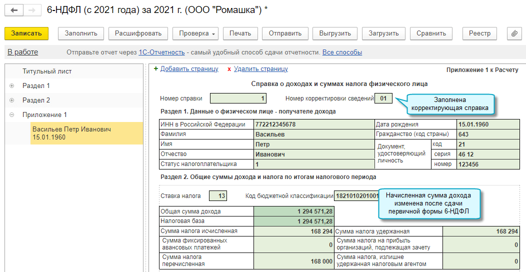 Добавлена возможность подготовить уточненную форму 6-НДФЛ, когда после ее сдачи изменены начисленные ранее доходы физического лица и НДФЛ. В этом случае заполняется корректирующая справка о доходах и суммах налогов физического лица.