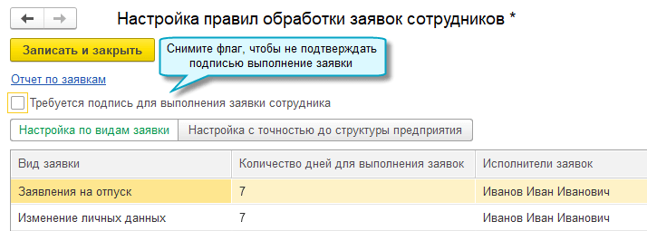 Добавлена возможность не подтверждать электронной подписью факт выполнения заявок сотрудников в сервисе 1С:Кабинет сотрудника. Она может использоваться, когда заявки выполняет сотрудник, у которого нет права подписи, и не требуется контроль выполнения заявок ответственными лицами. Не распространяется на документы, которые выдаются работнику и должны подписываться обязательно: справка о доходах (2-НДФЛ), справка с места работы.