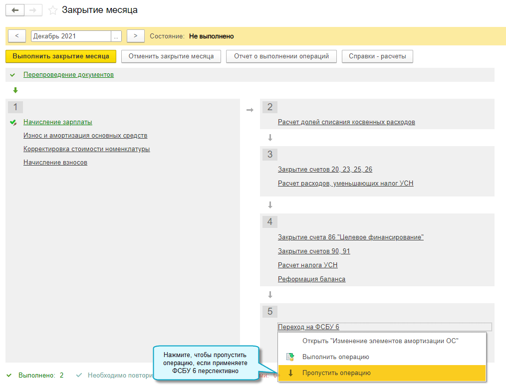 Регламентная операция по переходу на ФСБУ 6 перенесена в 5-ю группу закрытия месяца. Рекомендуется выполнить эту операцию вручную после подготовки бухгалтерской отчетности за отчетный год.