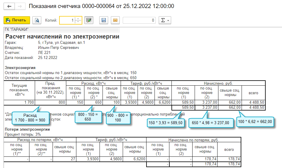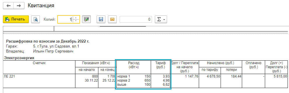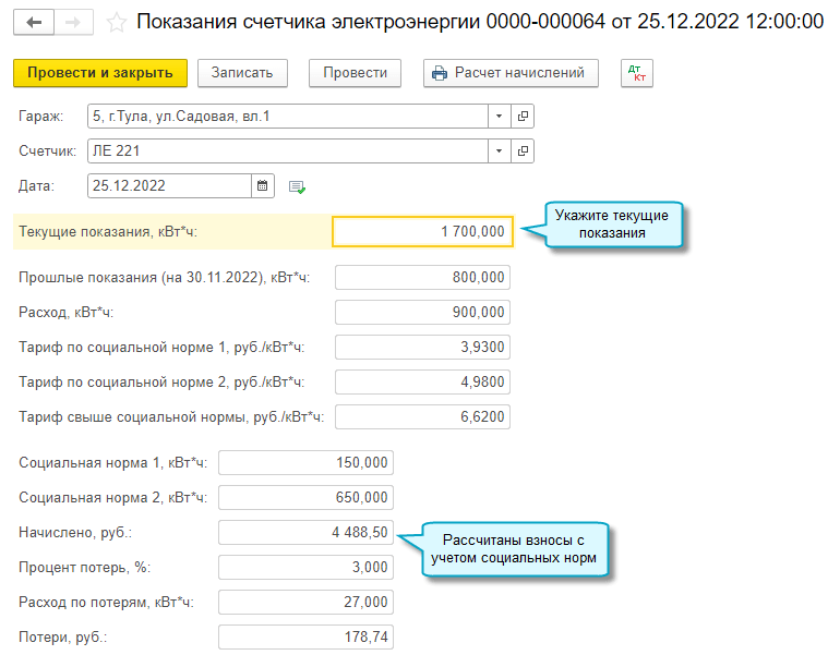 Добавлена возможность начислять взносы за электроэнергию по тарифам, установленным для трех диапазонов объемов потребления электроэнергии (мощности).