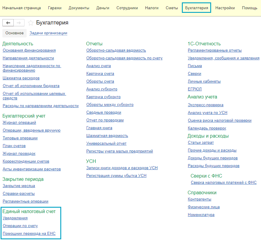 Простой интерфейс: меню "Бухгалтерия - Единый налоговый счет".