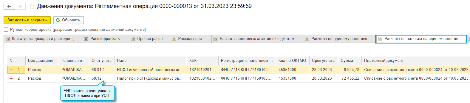 Добавлена возможность корректировать автоматический зачет ЕНП на уплату налогов и взносов, отражать в учете другие операции на едином налоговом счете без подачи уведомлений по исчисленным суммам налогов.