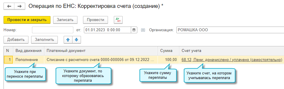 Используйте документ Операция по ЕНС с видом операции Корректировка счета для корректировки сумм, учитываемых на едином налоговом счете. Например, чтобы перенести переплату на ЕНС.