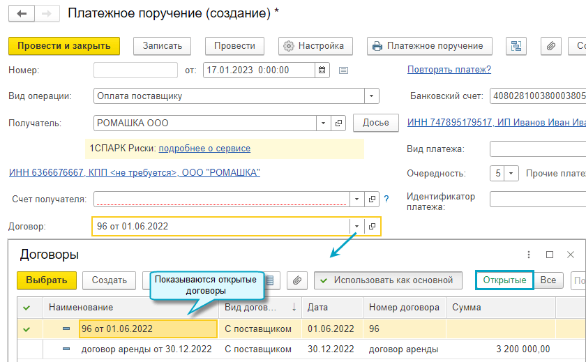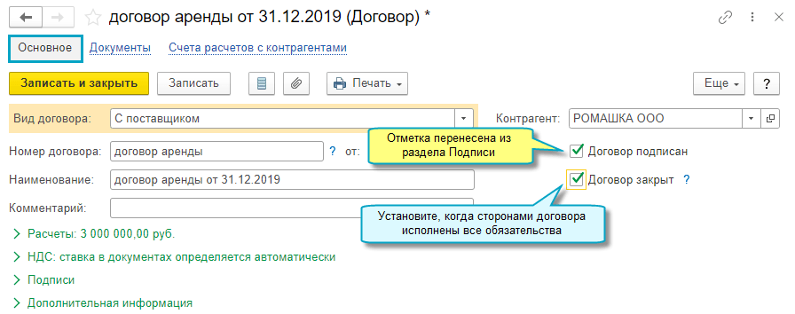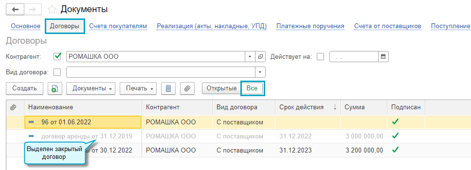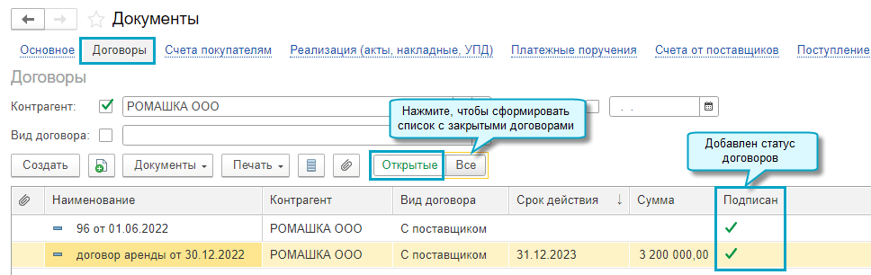 Добавлена возможность при работе со списком договоров видеть только открытые договоры, по которым поставки и расчеты ещё не выполнены. Для этого достаточно помечать закрытые договоры, обязательства по которым исполнены сторонами.