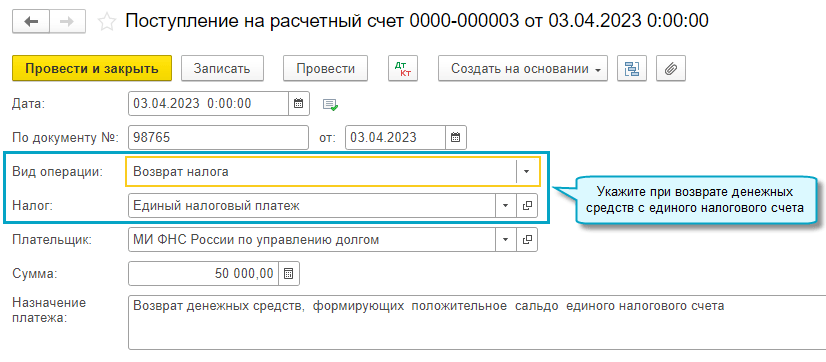 Добавлена возможность отразить возврат денежных средств с единого налогового счета в бухгалтерском учете и регистре по единому налоговому счету.