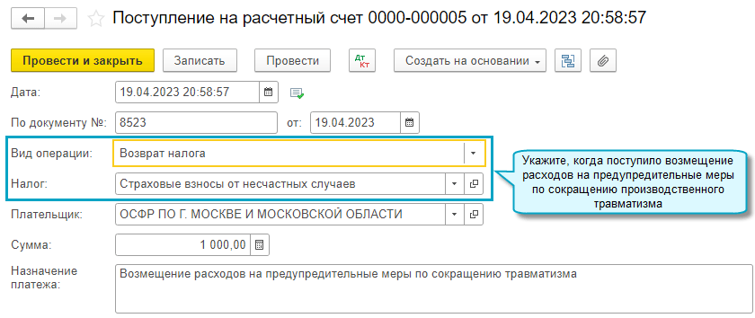 Добавлена возможность учитывать поступление из Социального фонда России возмещения расходов на оплату дополнительных выходных дней для ухода за детьми-инвалидами, на выплату пособия на погребение, на финансирование предупредительных мер по сокращению производственного травматизма и других расходов.