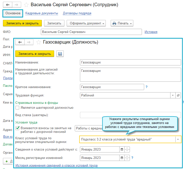 После сохранения сведений по сотруднику при печати формы ЕФС-1 заполняются результаты специальной оценки условий труда в подразделе 1.2 раздела 1.