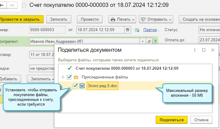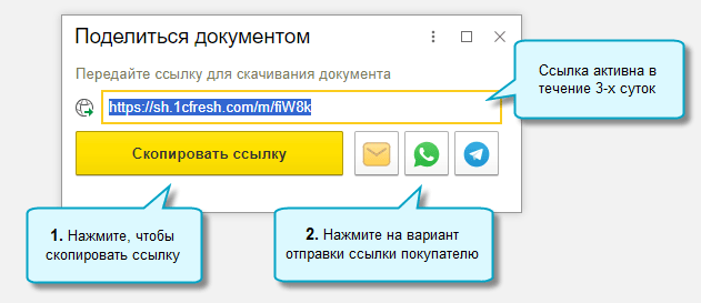 Со стороны поставщика - отправка покупателю ссылки на счет