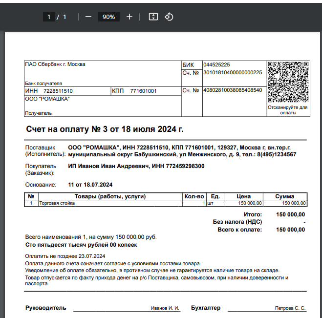 Если покупатель - ИП или физическое лицо, в печатной форме счета выводится QR-код, по которому можно оплатить счет через мобильное приложение банка, а если у поставщика настроен прием платежей через СБП - оплатить по QR-коду через СБП.