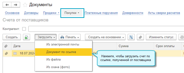 Загрузка по ссылке доступна также из списка счетов от поставщиков.