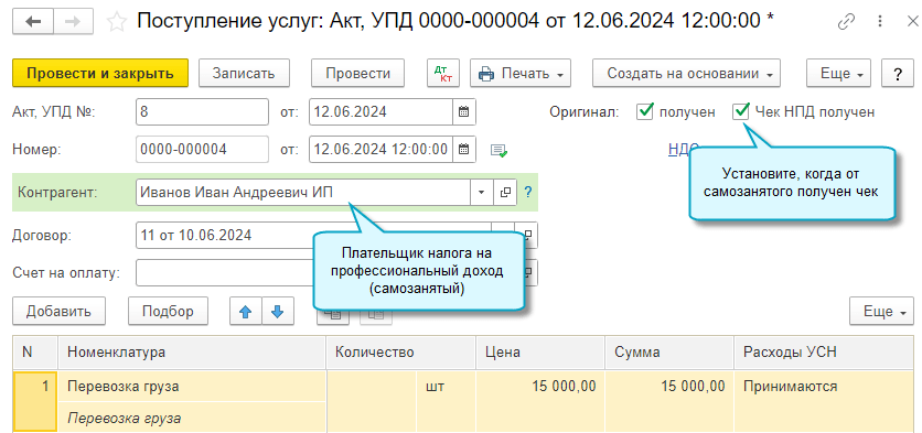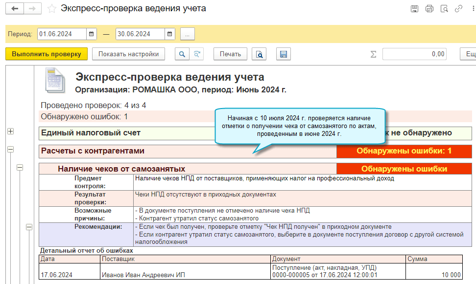 Теперь удобнее контролировать соблюдение этого требования, достаточно в договоре указать, что он заключен с самозанятым и в документах поступления ставить отметки при получении чеков. Тогда в ходе экспресс-проверки ведения учета проверяется наличие чеков от самозанятых по оформленным с ними актам и накладным.