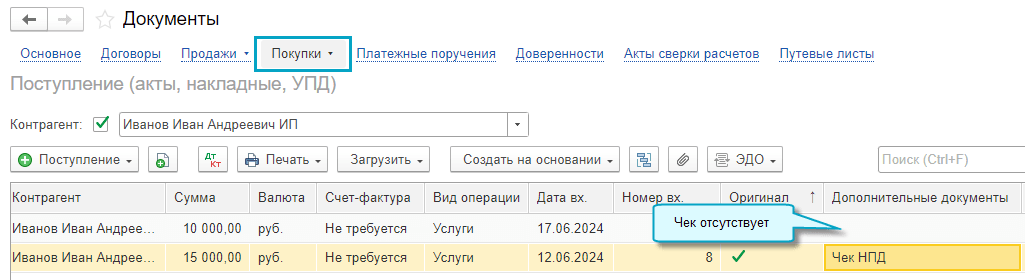 Простой интерфейс: меню "Документы - Покупки - Поступления (акты, накладные, УПД)".