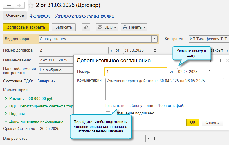 После получения дополнительного соглашения, подписанного другой стороной, откройте карточку договора и поставьте отметку о его подписании.