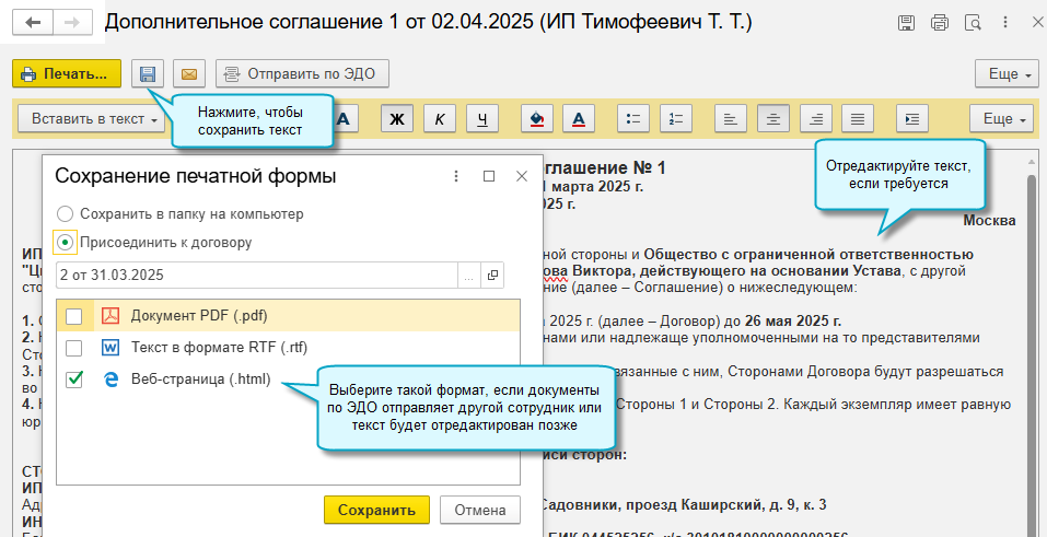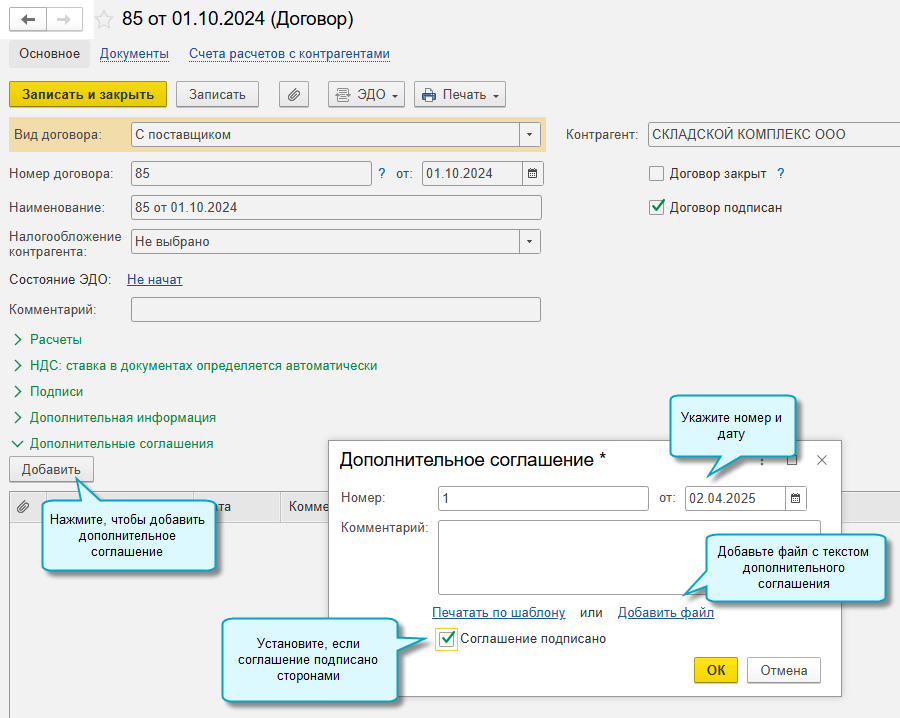 Дополнительные соглашения, подписанные ранее или без использования ЭДО, можно добавить к договору вручную.
