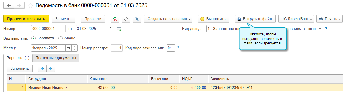 Добавлена возможность выгружать в файл ведомость по зарплате при подключенном обмене с банком через 1С:ДиректБанк, когда это требуется.