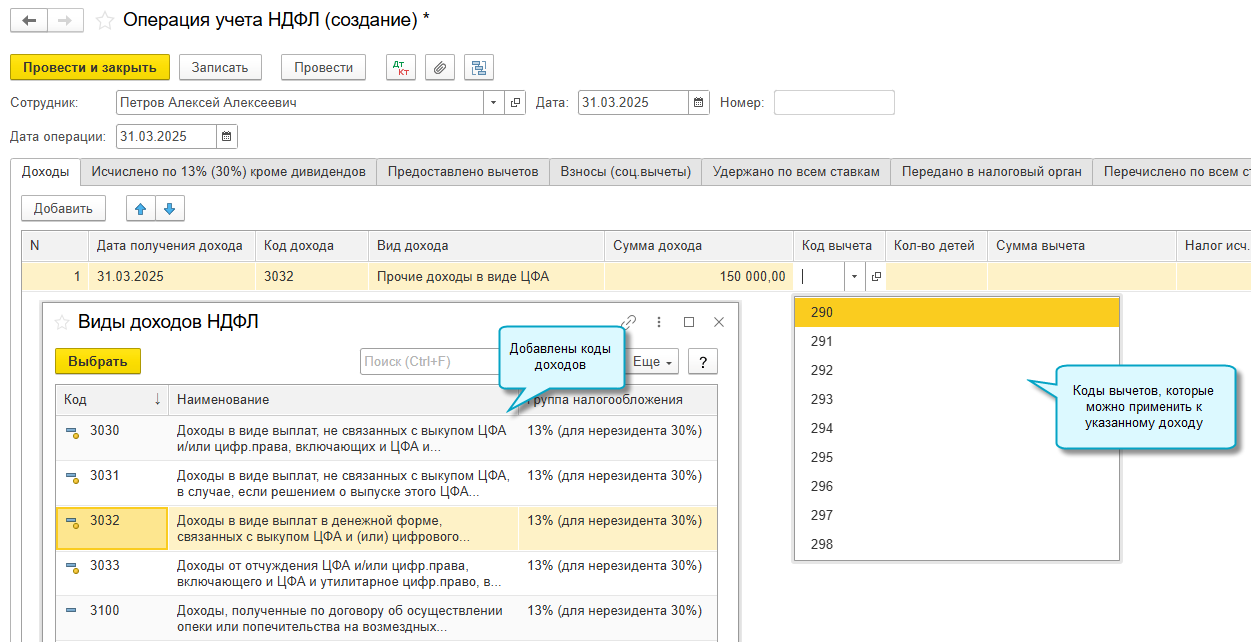 Обновлены коды доходов и вычетов по НДФЛ (Приказы ФНС от 18.10.2024 № ЕД-7-11/877@, от 16.12.2022 № ЕД-7-11/1216@ (в части цифровых активов)).