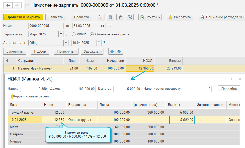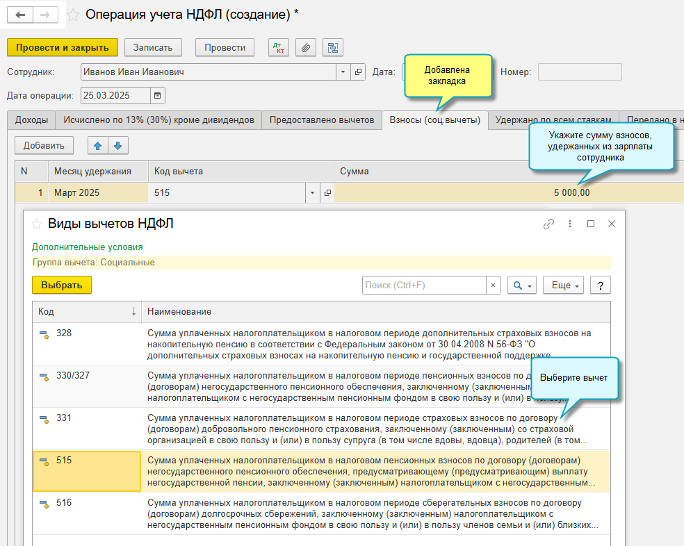 Чтобы применить вычет, его сумму требуется зафиксировать в документе "Операция учета НДФЛ".