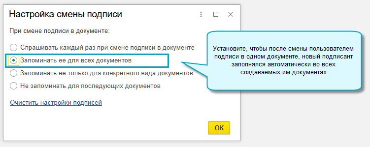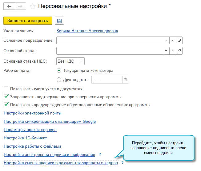 Добавлена возможность настроить для каждого пользователя, как будет заполняться подписант в документах зарплаты и кадров после смены подписи в документе.