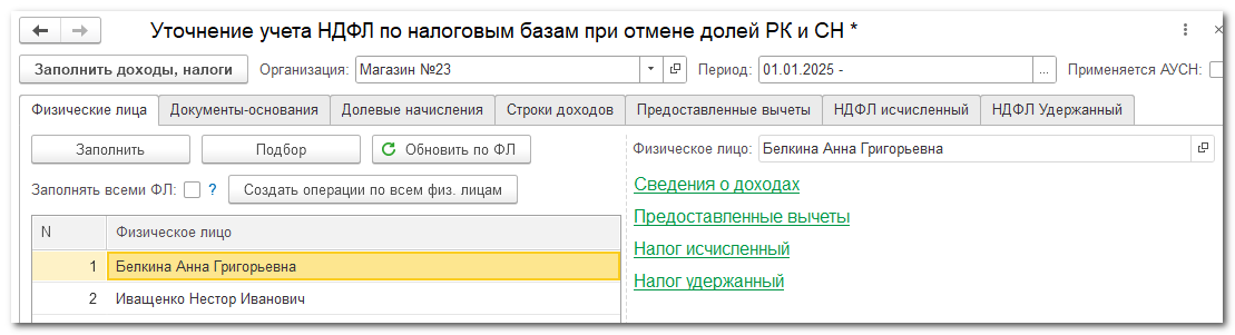 При взведенном флажке "Заполнять всеми ФЛ" кнопка "Заполнить" заполнит физ. лиц, которые получали доход с "долевыми" начислениями. При снятом флажке не заполняются физ. лица, по которым есть документ операции учета с комментарием "Создан автоматически обработкой уточнения учета НДФЛ…"
