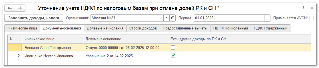 На вкладке "Документы-основания" заполнится список сотрудников и документов-оснований, в которых был начислен доход по "долевым" начислениям в среднем заработке. Флажком "Есть другие доходы по РК и СН" помечены те, в которых, помимо оплаты по среднему заработку, выполнялись другие начисления РК и СН (например, начисленные с зарплаты при увольнении).
